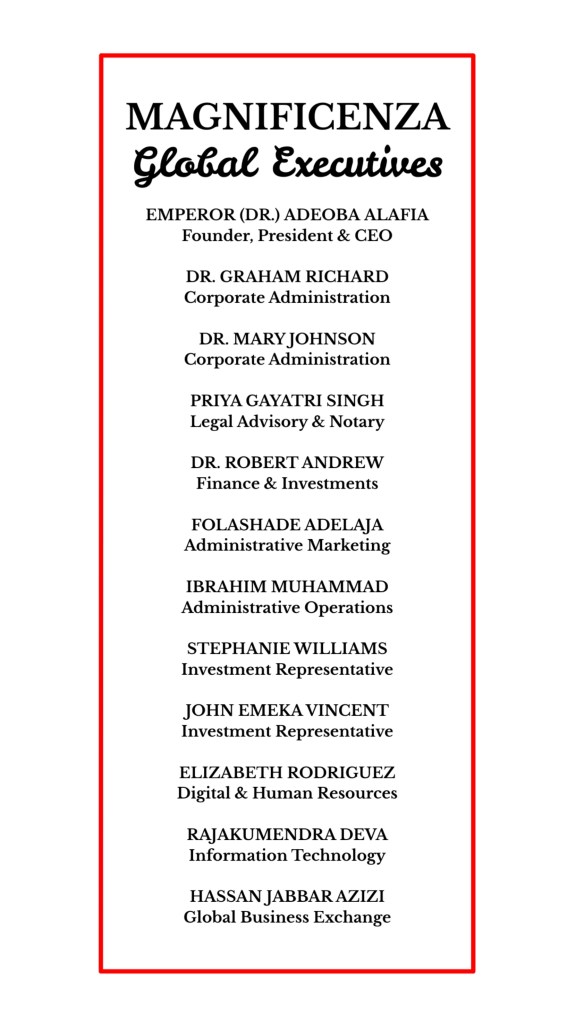 Emperor (Dr.) AdeOba Alafia is the Founder & Executive Director Of Magnificenza… He had Bachelor Of Arts (B.A) in Philosophy, Master Of Arts (M.A) in Philosophy, Doctor Of Philosophy (PHD), Executive Master Of Business Administration (EMBA) in Business Leadership & Management… With many years of consultancy experiences, he has established his outstanding legacy as a quintessential advisor to international organizations across various sectors. He has empowered businesses to achieve unparalleled success, and expertly executing operational excellence, leadership development and business transformation. As a global leader, humanitarian and grandmaster, he has been honored with many “Lifetime Achievement Awards” and also featured prestigiously at several international elite events.